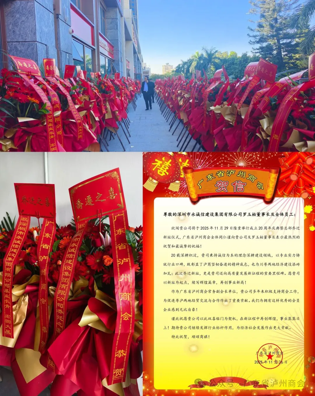 作为广东省泸州商会名誉会长单位,永诚信集团及罗玉柏董事长长期以来积极支持商会各项工作,在促进粤泸两地经贸交流合作、推动区域经济发展等方面作出了重要贡献。商会在贺信中高度评价,永诚信集团二十年来深耕建设领域,以专业实力铸就行业口碑,生动诠释了泸商坚韧奋进、诚信经营的精神底色,为川粤两地经济建设添砖加瓦。