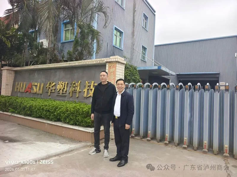 春潮涌动处,奋进正当时。2026年1月31日,广东省泸州商会常务副会长兼秘书长胡登举一行专程赴中山市,拜访泸州籍优秀企业家、华塑科技实业有限公司总经理潘林先生,并深入企业生产一线,实地考察企业发展情况,共叙桑梓情谊,共商合作发展大计。