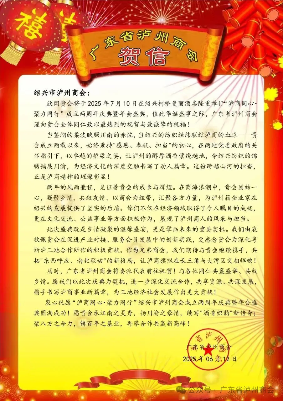 在收到庆典邀请的第一时间,广东省泸州商会便精心准备了饱含深情的《贺信》,以文字传递跨越山河的深厚情谊,盛赞泸商担当,对绍兴市泸州商会以“泸商同心,聚力同行”为主题的成立两周年庆典暨2025年年会致以最热烈的祝贺与最诚挚的祝福。
